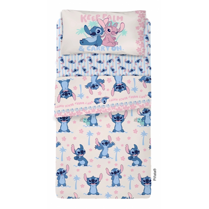 Juego de sábanas Piñata Ultra Soft “Stitch IV” 1½ plaza en tela Ultra Soft (100 % poliéster). Incluye plana, ajustable y funda. Para colchón hasta 90×190×25 cm.